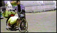 굶주린 북한 주민을 돕기 위해 자전거에 식량을 가득 싣고 출발하는 한 조선족 |
